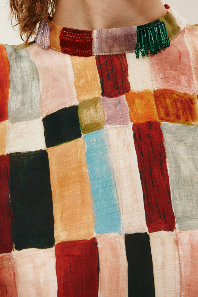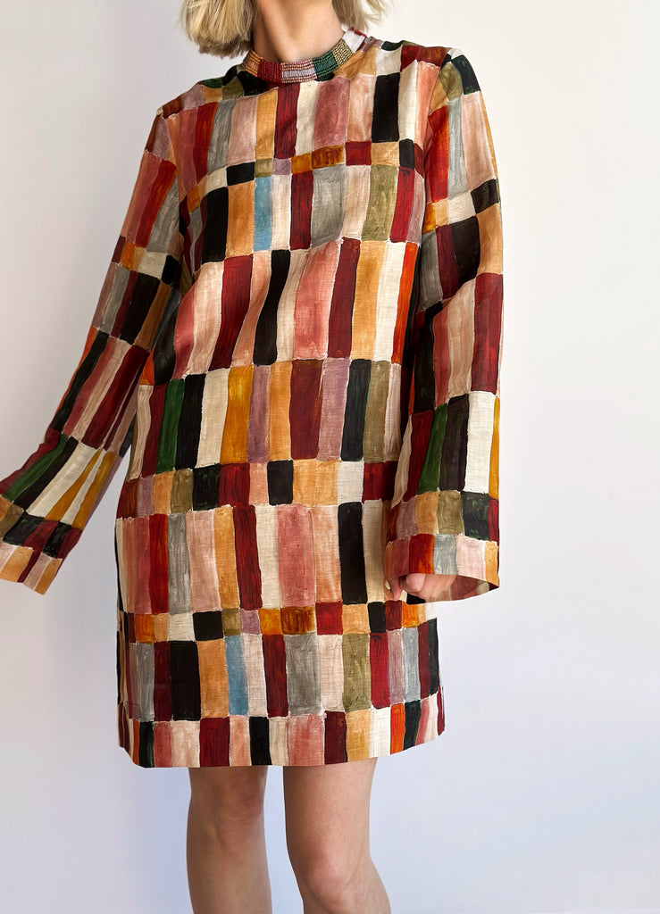Artwork in collaboration with Laurence LeenaertRelaxed mini dress silhouetteRound neck with button and loop closure at centre back
