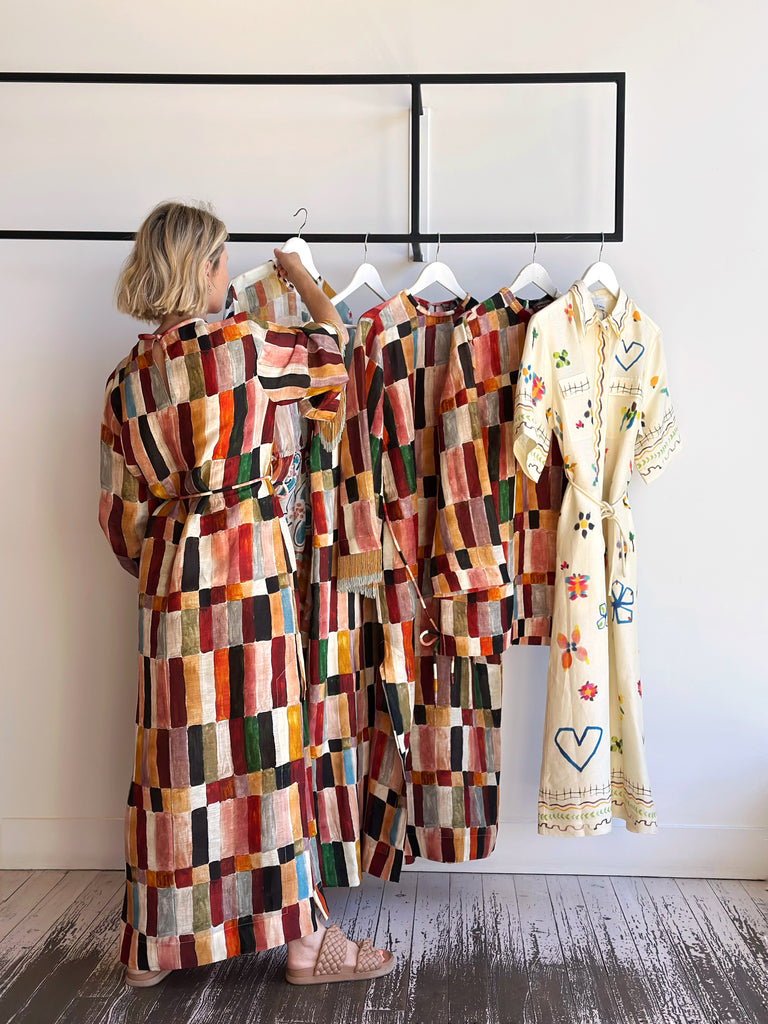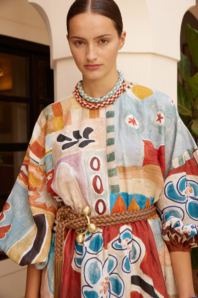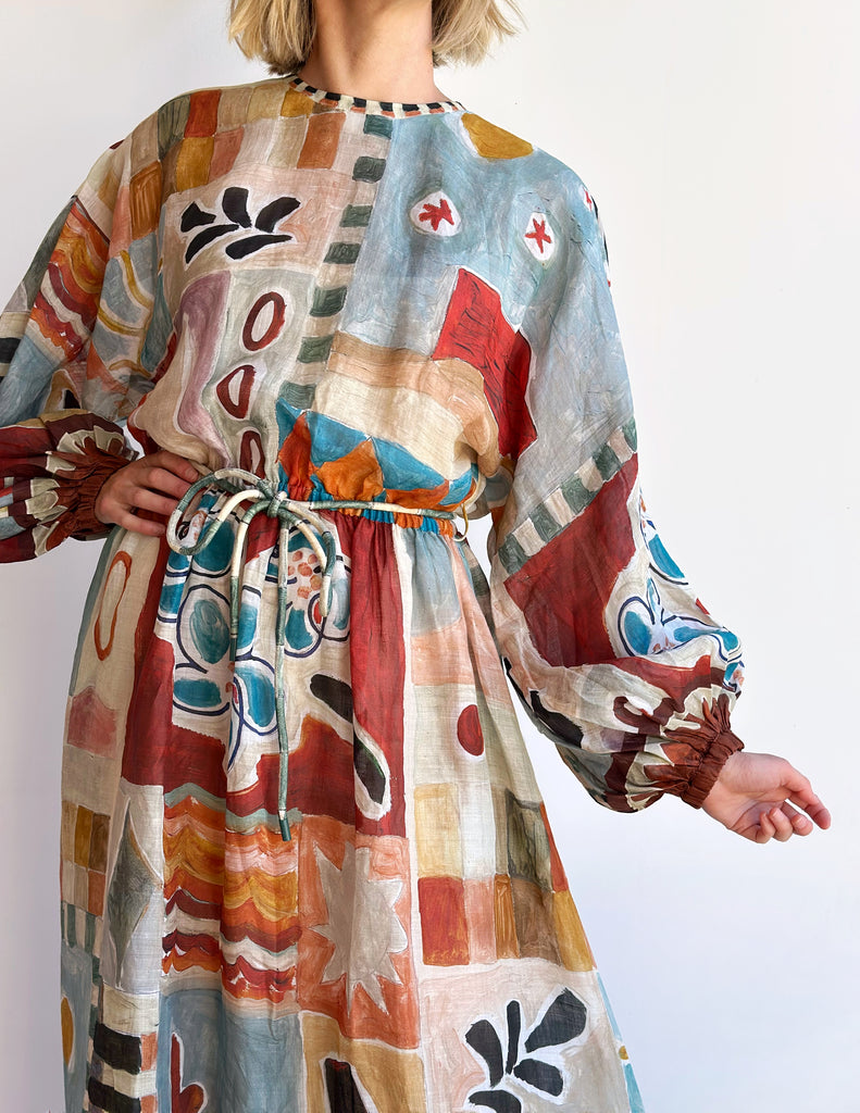 Artwork in collaboration with Laurence LeenaertRelaxed midi dress silhouetteRound neckButton and loop at back neckPuff sleeve with elasticated cuff