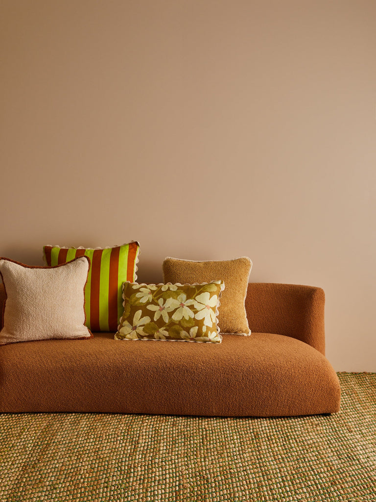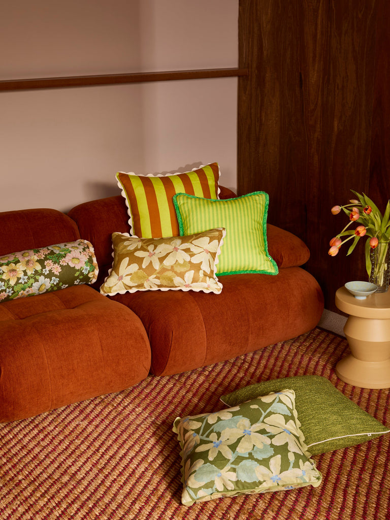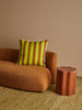 A vibrant lime green linen cushion with our Bold Stripe design, bringing retro joy and garden-fresh energy