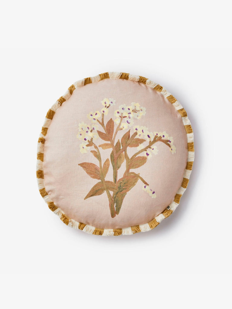 This round linen cushion is dotted with tiny Forget Me Not blooms in caramel, bringing a sentimental floral touch and earthy warmth to your home