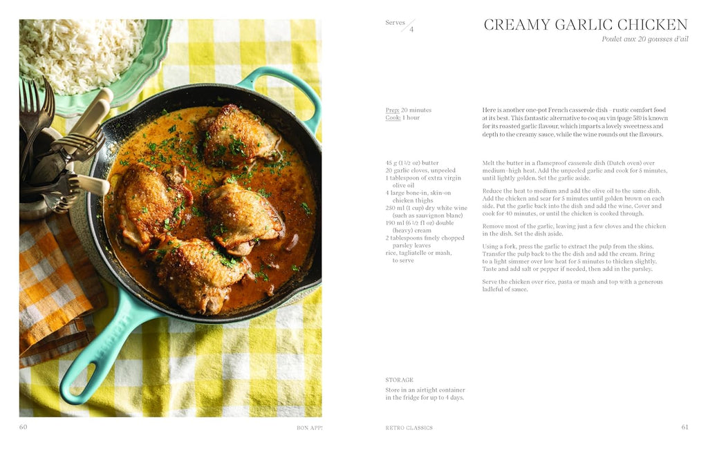 Separated into thirteen chapters and supplemented with suggested menu pairings to create your own feasts, Bon App! shares recipes for every kind of dining occasion, from Apéro Hour snacks like Confit leeks and Camembert madelines, to Retro Classics such as Cheese soufflé and Coq au vin