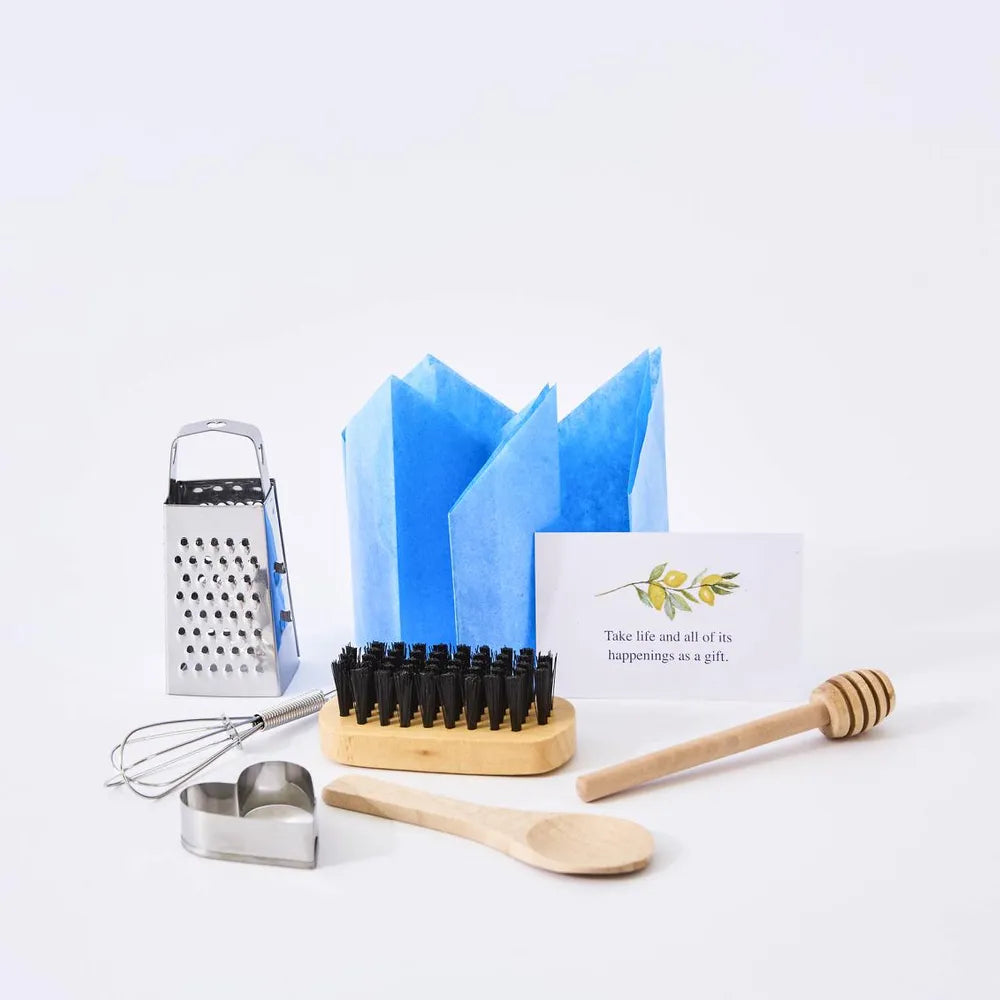 Each one filled with mini handy gifts for the kitchen, a paper hat and a quote