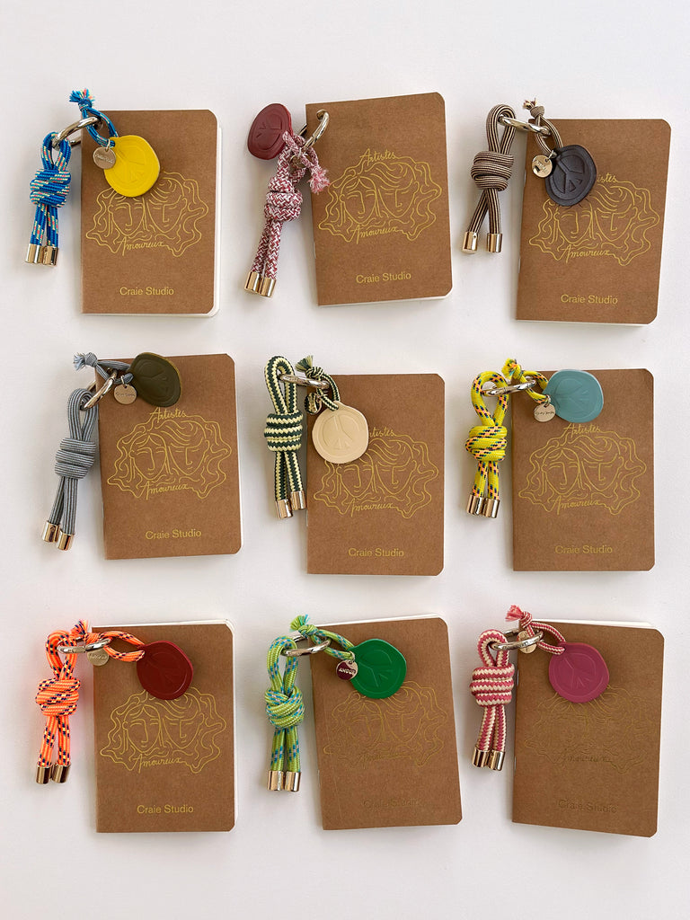 It is mounted on an openable ring, and accompanied by a "Peace" logo in leather and a gold "Love" medal