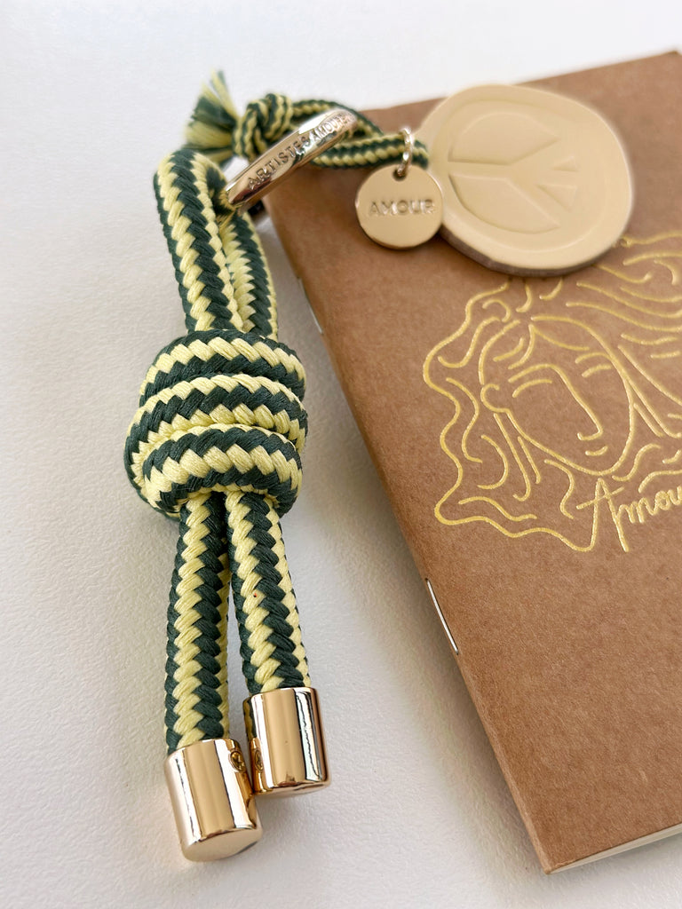 It is mounted on an openable ring, and accompanied by a "Peace" logo in leather and a gold "Love" medal