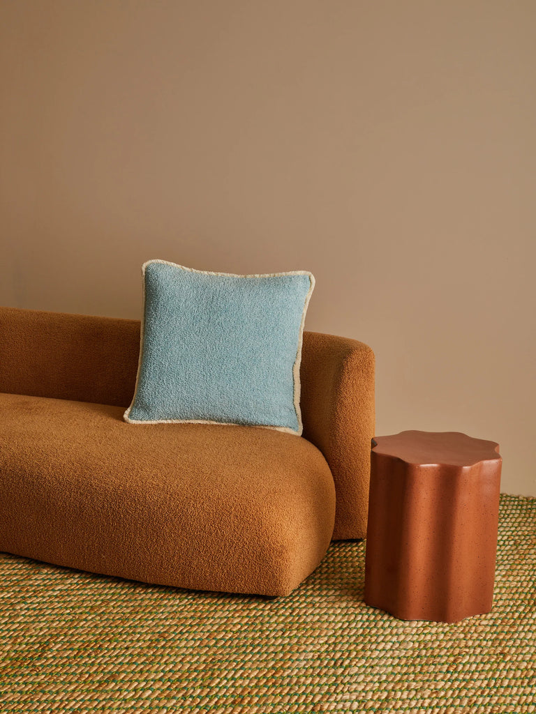 In a soft blue tone, this textured cushion offers understated warmth and balance, pairing beautifully with expressive patterns