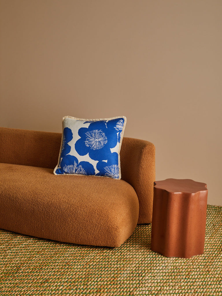 This blue linen cushion showcases the bold floral forms of our Jardin print, inspired by the sculptural beauty of anemones