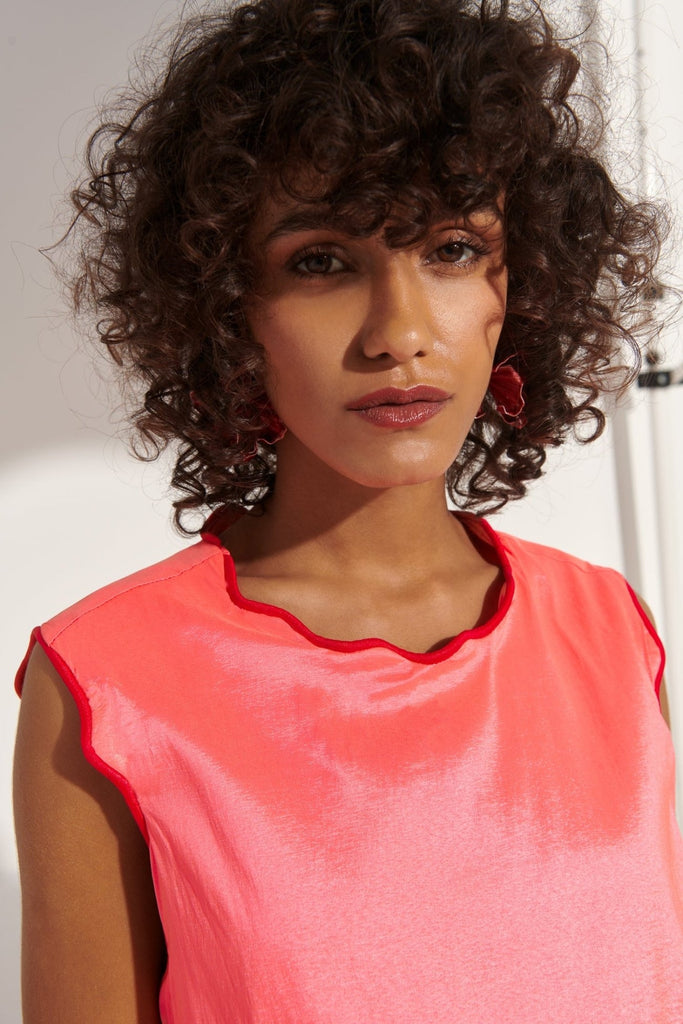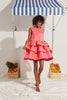 Cut in a lustrous coral fabric with a dramatic tiered silhouette, it’s designed to move, and turn heads with every step