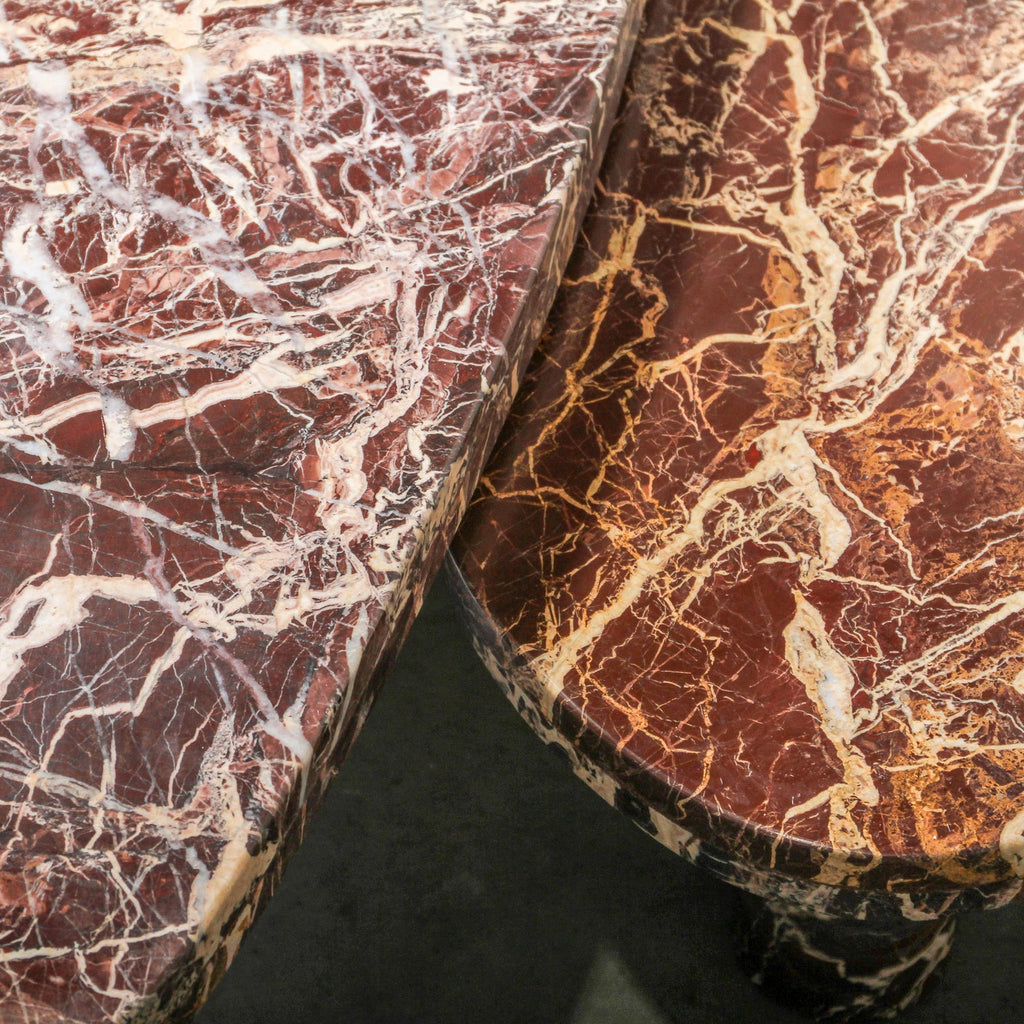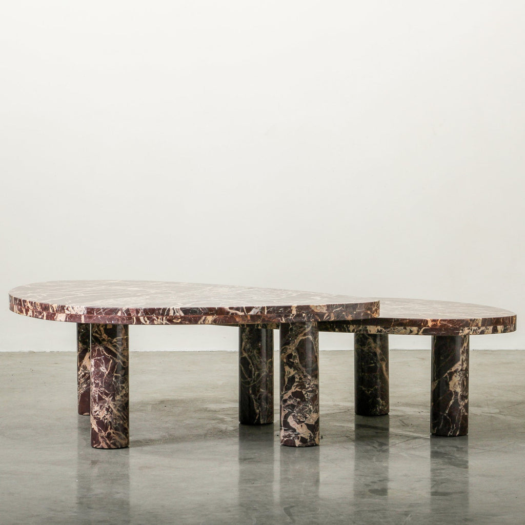 Crafted entirely from Cherry marble, this table blends deep burgundy tones and subtle veining with a softly contoured silhouette