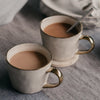 Handmade and glazed in a reactive glaze in different colours and gilded with gold around the rim and the handle