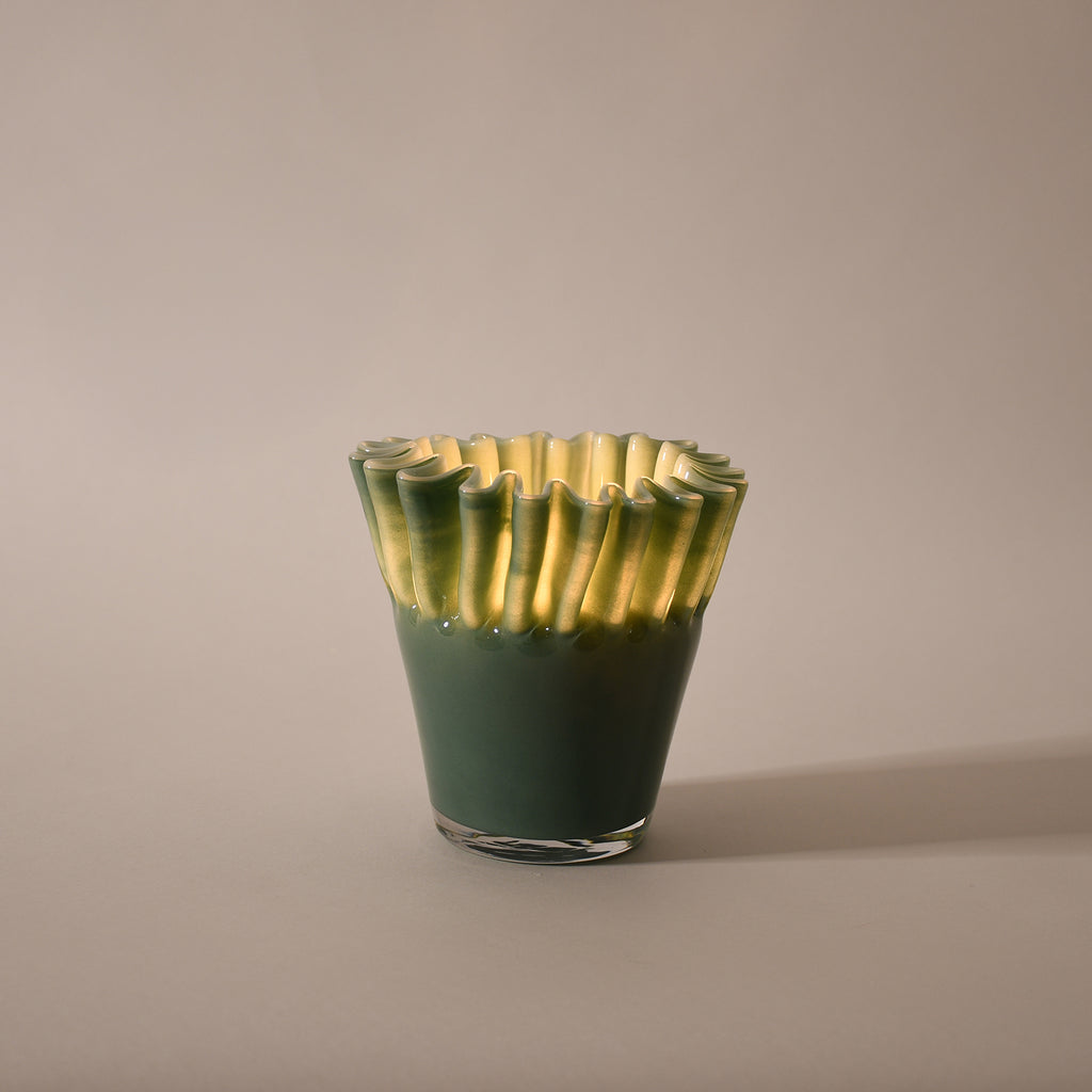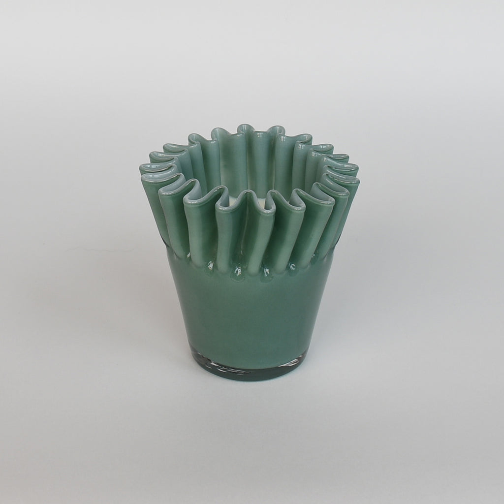 Scented candle in a sculptural sage coloured glass jar