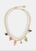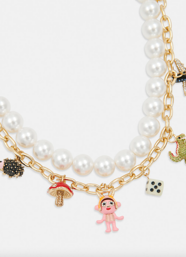 One strand features a timeless row of luminous pearls, while the second adds a bold and quirky twist with gold-tone hardware adorned with enamel and rhinestone-encrusted charms