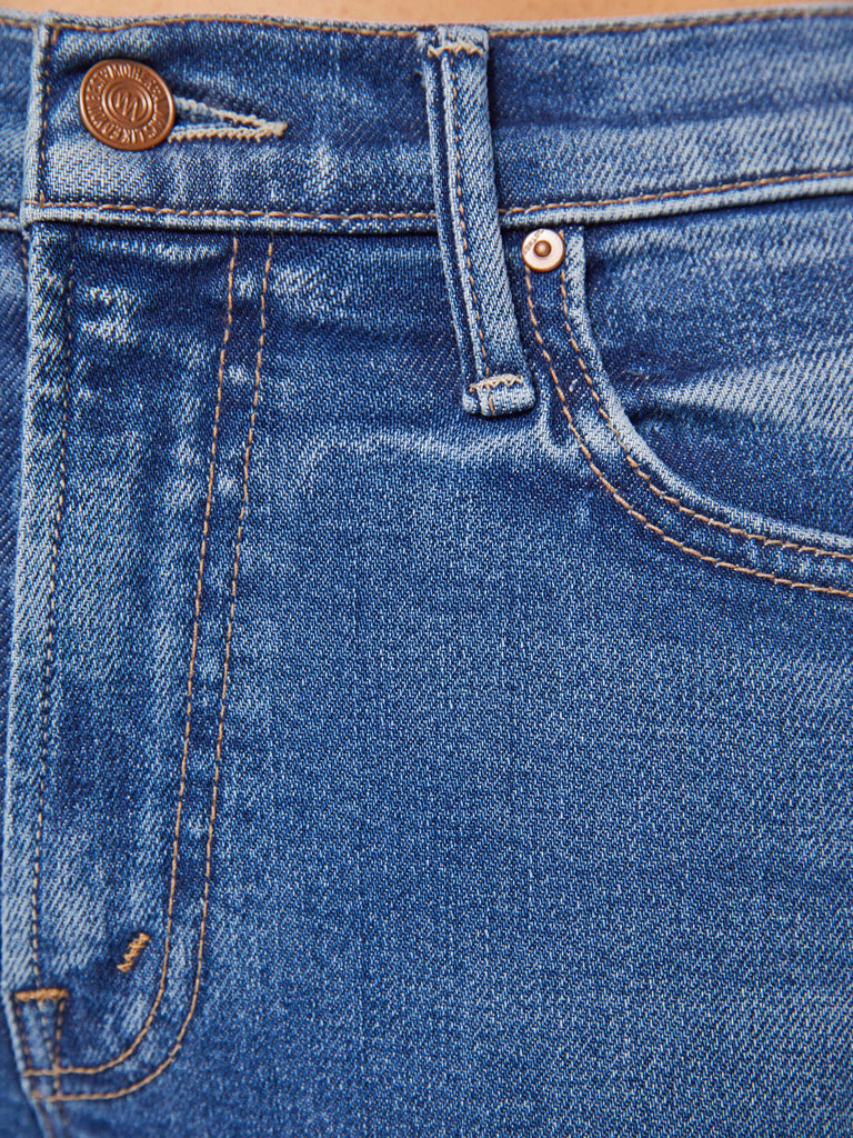 Made from stretch denim, Dugout Doobies is mid blue with whiskering and fading at the knee