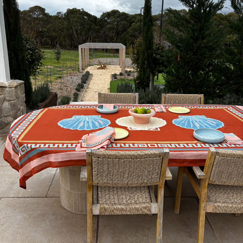 Reminiscent of a rocky seaside hideaway, Cove is illustrated with three scallop shells surrounded by a bold meander motif in a pallet of deep browns, pinks and blue