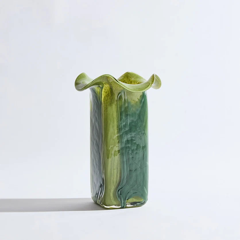 Handcrafted from high-quality glass, each piece features soft, painterly swirls of colour, framed by a dramatic, sculpted rim