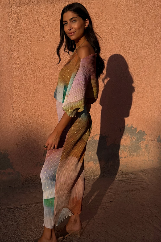Designed in-house, our bestselling metallic fleck print featuring gold brushstrokes, that are highlighted by the sunlight, on a super chic abstract print