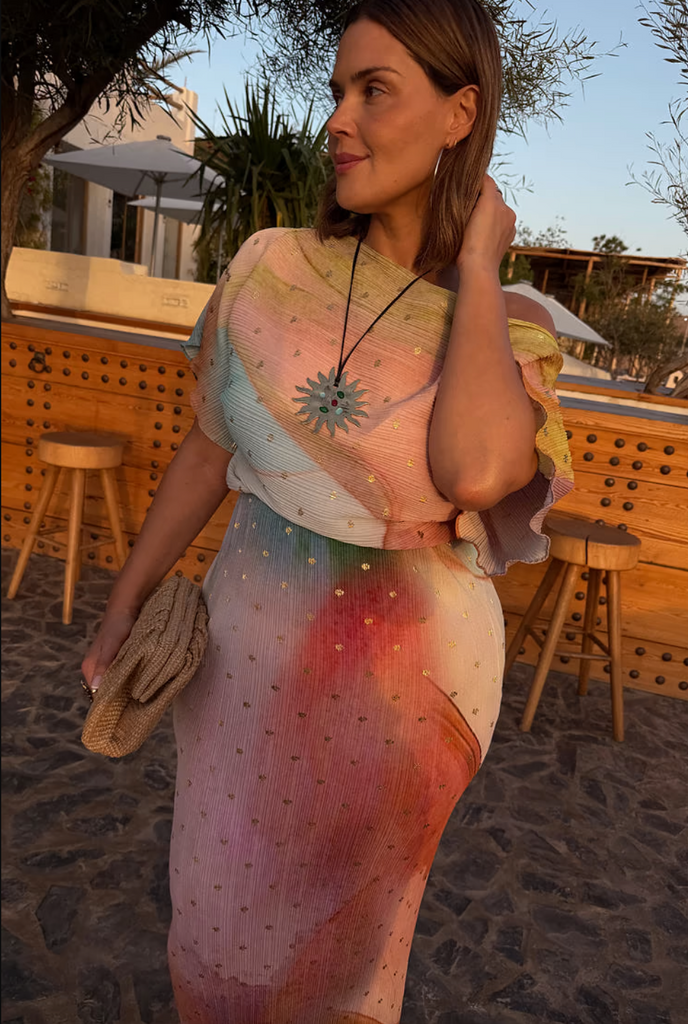A fitted skirt with a slightly more voluminous top, it gives the most perfect shape for vacations, parties or summer weddings