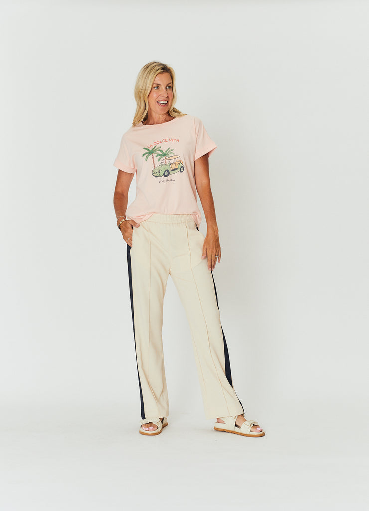 Introducing the new Alba Pant in an ivory colour, featuring a stylish contrast black stripe down the side leg