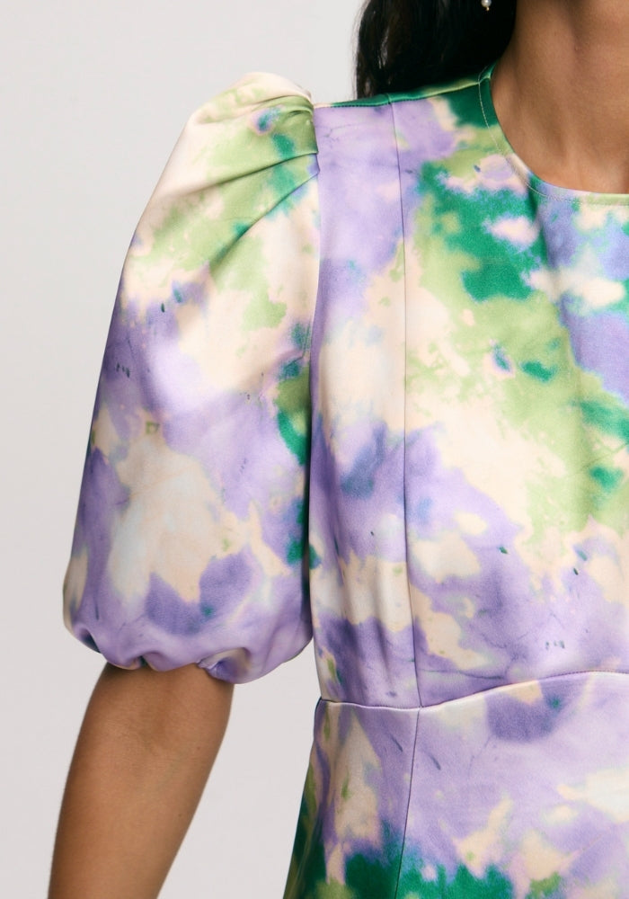 The fitted silhouette, paired with a round neck and puff sleeves, exudes sophistication and exclusivity