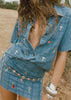 Embroidered desert motifs—each drawn from hand-painted works by Whitney Spicer—are carefully placed across the silhouette, adding texture and story to every panel