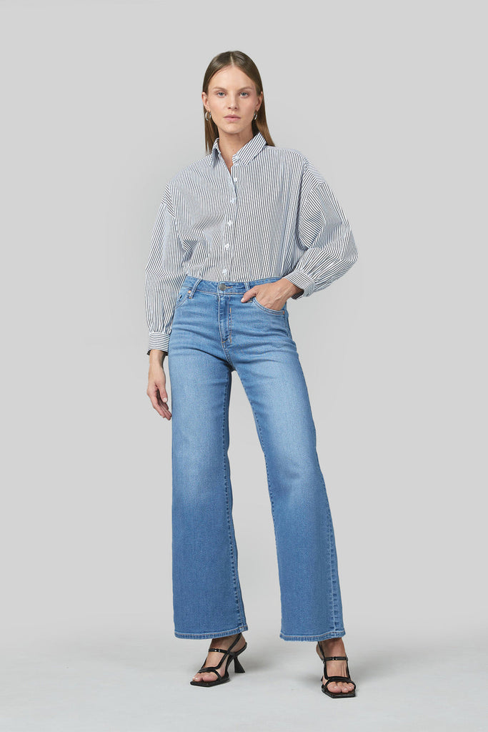 The Marrie Wide Leg Flare Jeans in Rodeo Blue are by Dricoper
